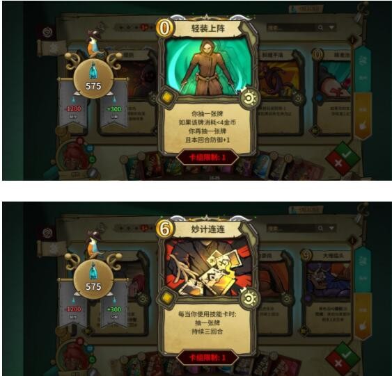 轻装上阵和妙计连连用于牌组的过牌,十分好用,上手就是好牌,带满。