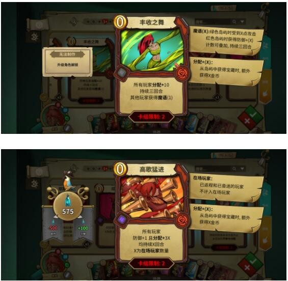 丰收之舞和高歌猛进是十分好用的两张buff牌,需要注意丰收之舞和高歌猛进可以用于开局防护和第一桶金的获取,月光之舞用于拉绿岛,需要配合共舞buff,当仅剩一回合共舞且当前为红岛时可以拉一手绿岛,还骗掉了其他人的防护牌。丰收之舞适合身上有共舞,第一个绿岛挂共舞,第二个绿岛挂buff。而高歌猛进适合第一个红岛挂防护和buff,第二个绿岛挂共舞。可以赚的盆满钵满。这三张牌带满总共6张。