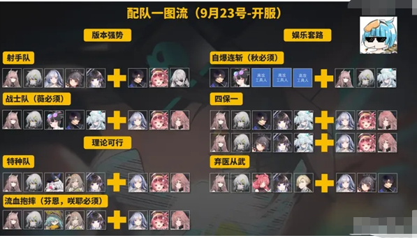 目前射手队和战士队互为版本强势队伍。兼具伤害,续航,抗压等能力,在队伍中搭配了秋或缠枝均能做到一招清屏。替补位可放入一些功能型人形。