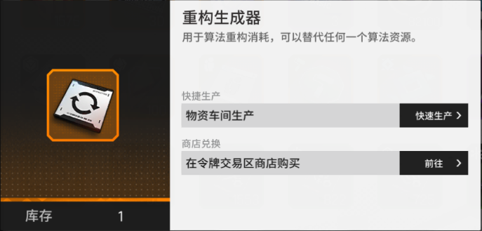 重构生成器目前仅有两种获得方法,一是通过物资车间的生产获得,二是在令牌交易区商店购买获得。