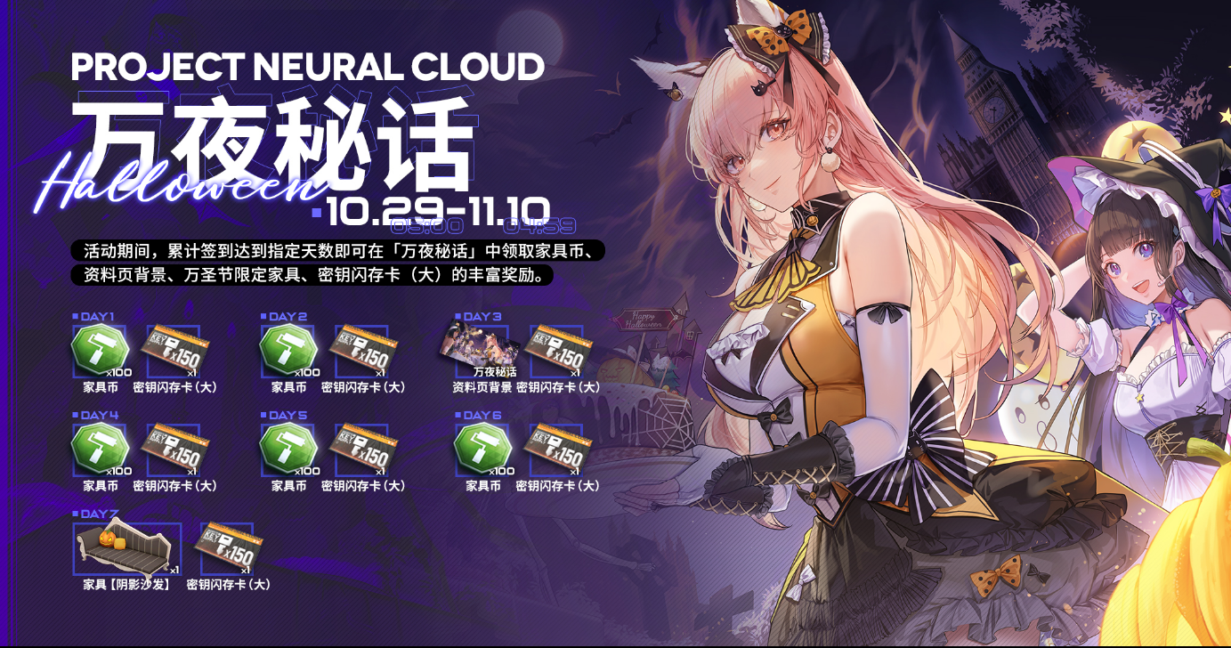 活动期间,累计登录达到指定天数即可在「万夜秘话」中领取资料页背景【万夜秘话】、万圣节限定家具、家具币、密钥闪存卡(大)的丰富奖励。