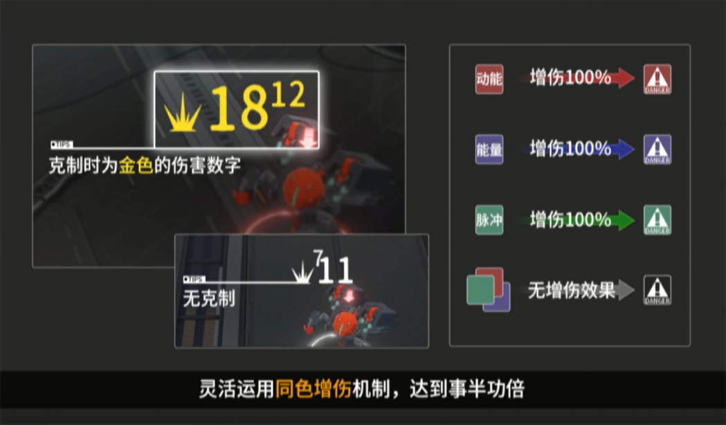 每个角色均存在自身的属性颜色,若攻击相应颜色的敌人便会有额外伤害,并削减精英以及BOSS的力场槽,为我方创造战斗优势。