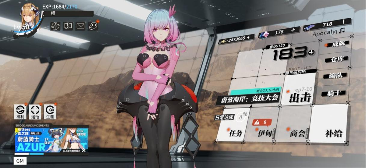右侧则都是游戏主要的玩法功能。上方显示了当前的联合币(游戏币)、量子结晶(抽卡用)、商业凭证(氪金点券)。下方是体力值,最大120点,6分钟回1点,可别溢出哦。再下方的“出击”则是我们要面对的各个关卡地图。右侧一列中,当满足一些条件后便可在“成就”界面领取量子结晶;“仓库”显示了已有的武器、材料等道具;“编队”可以提前准备好要作战的角色;“骑士”则是进行角色养成的地方。最下方,“任务”顾名思义,每天看下完成情况,别忘了领取奖励;“伊甸”是家园系统,需要通关主线2-10才能开启;“商会”里可以买到许多材料;而“补给”则是众所周知的抽卡了。