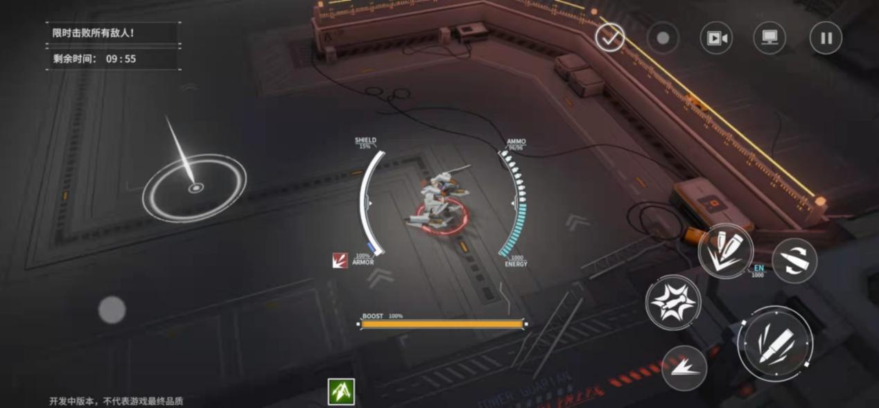 游戏为即时战斗模式,玩家通过左侧触屏摇杆进行移动,右侧按钮进行射击、技能、冲刺、换人等操作。