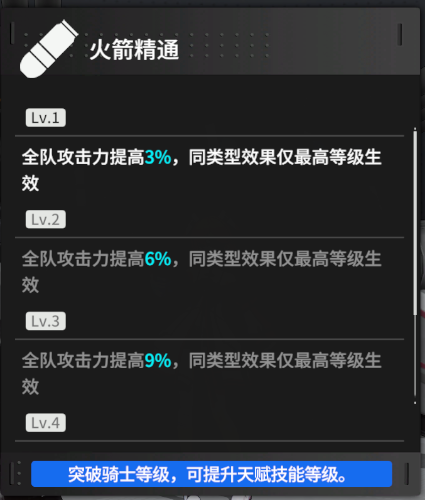 常规的武器精通效果,标准天赋,桃乐茜属于火箭类,因此也是比较受欢迎的全队攻击强化,1级提供3%,满级提供15%。