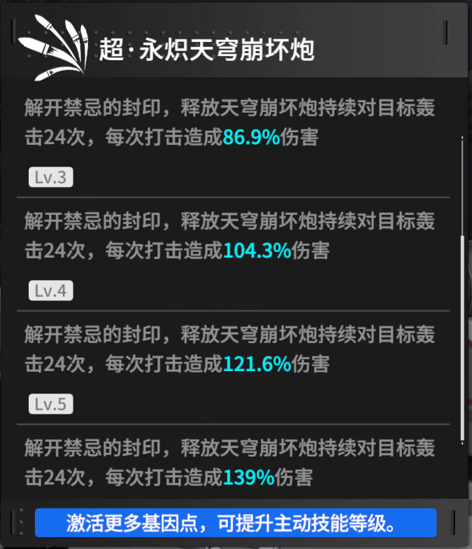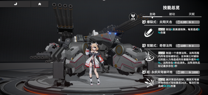 主要强化【超·永炽天穹崩坏炮】,每一枚导弹都有50%的概率造成额外60%(满级180%)对力场伤害,配合【觉醒式:奇想法阵】,满级时可以达到的260%的对力场伤害,因此在战斗中,先使用【觉醒式:奇想法阵】再使用【超·永炽天穹崩坏炮】,依靠较高伤害倍率,可以打出非常高的对力场伤害。