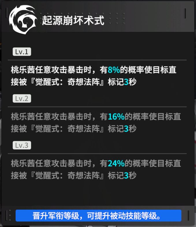 暴击的时候额外赋予目标【觉醒式:奇想法阵】的标记效果,可以让桃乐茜在没有【觉醒式:奇想法阵】的情况下,也能有效的对目标造成额外力场伤害,被动1级的时候概率只有8%,但是满级的时候高达24%,桃乐茜攻击速度快还是非常容易触发,只是触发依赖暴击,因此在装备的选择上可以优先考虑暴击率。