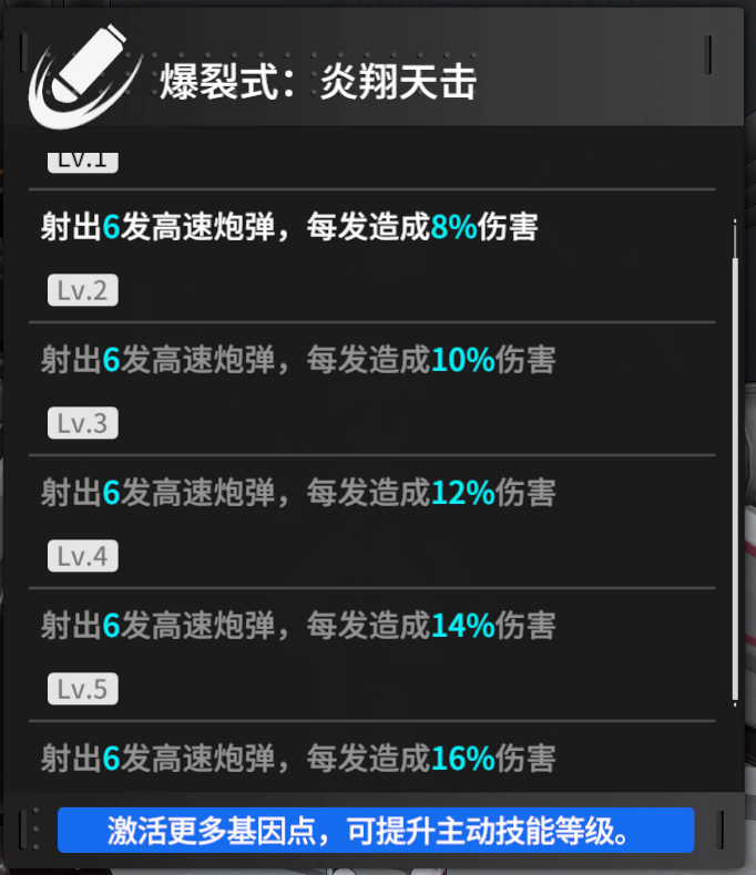 常规攻击效果,类似突击枪,中规中矩,一次射出6发,每发伤害8%(满级16%)。