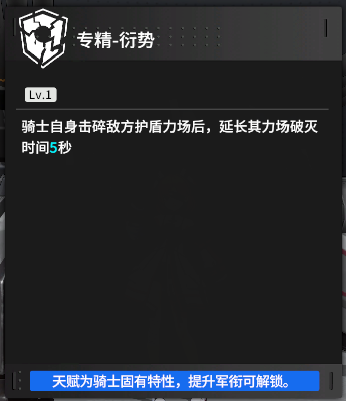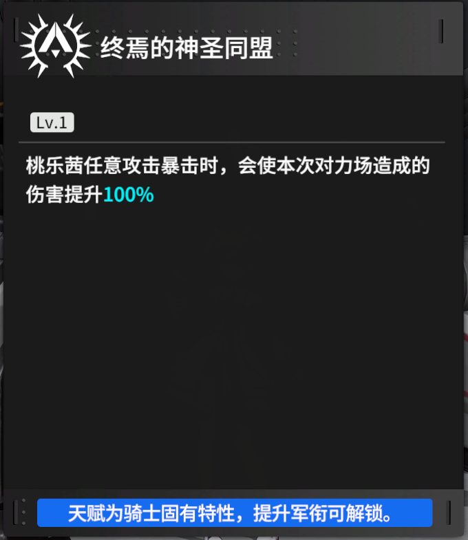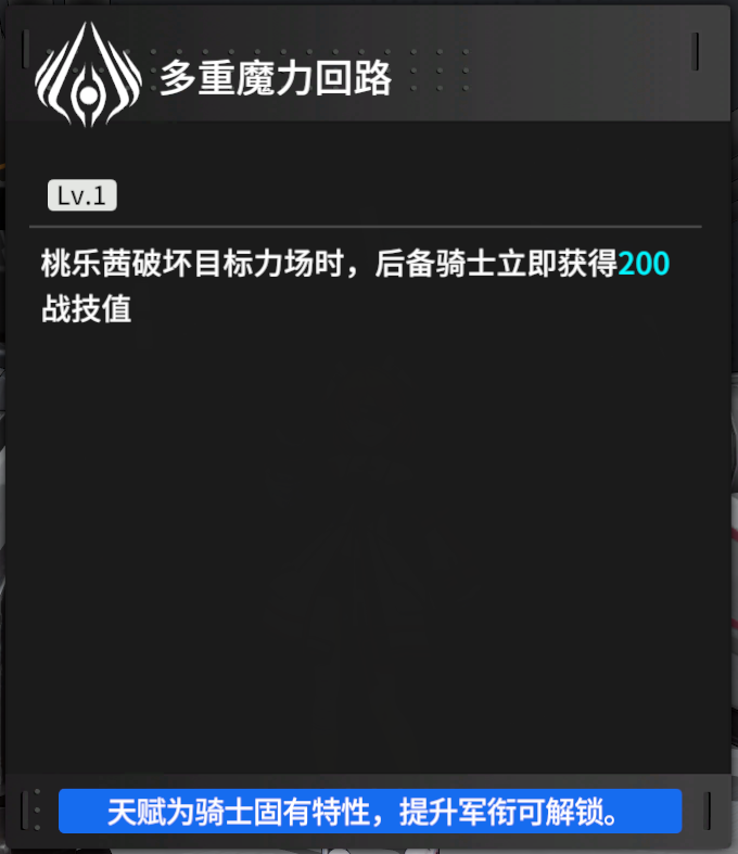 桃乐茜击碎目标力场后,会为后备骑士回复200骑士战技,偏辅助方向的一个天赋效果,对于需要多次击碎力场的BOSS战,有比较高的价值,可以让火力角色爆发更快,节奏更好。