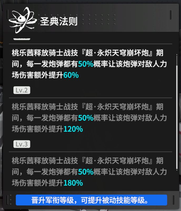 任意暴击都会让对力场伤害提高100%,本来暴击后就是150%的额外伤害,在加上100%的破盾提升,使得每次暴击实际可以达到150%的对力场伤害,本身配合暴击导致的伤害提升,实际破盾会达到一个非常夸张的数值,再配合满级【觉醒式:奇想法阵】的80%提升、满级【圣典法则】的180%提升,使得骑士战技【超·永炽天穹崩坏炮】的上限变得十分夸张,同样该天赋依赖暴击率,因此在装备选择上尽量多一些暴击率属性。