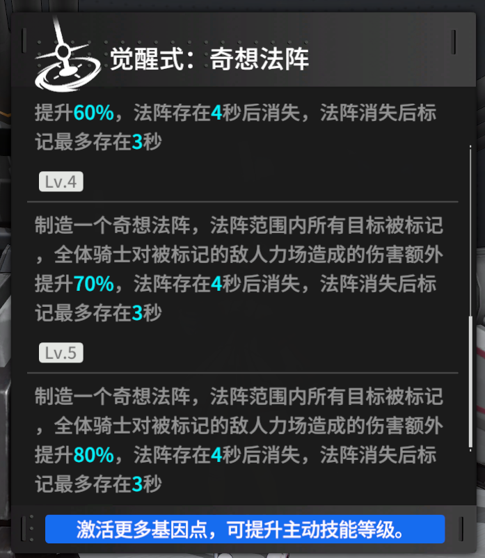 桃乐茜的核心技能,该技能最大的价值可以让全队成员对目标造成的力场伤害提高,持续时间7秒(法阵存在4秒 + 延后3秒),强化效果40%(满级高达80%),换而言之哪怕桃乐茜没有战技可以释放,也可以通过该技能配合另一名破盾/火力/支援角色打出成吨的力场伤害。