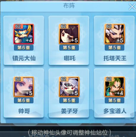 点击阵容右上角的布阵图标可进入布阵功能,移动神仙头像调整神仙站位,达到更好的战斗效果。