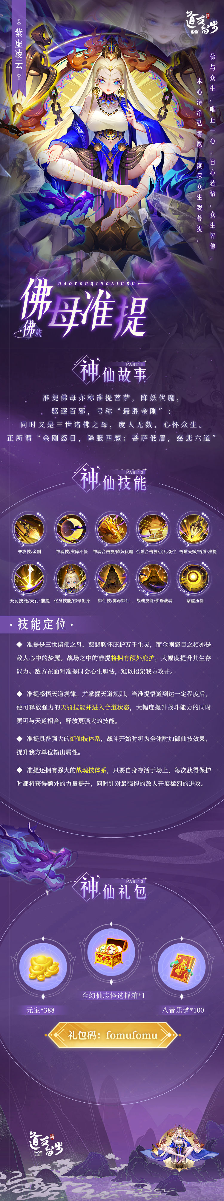 准提感悟天道规律,并掌握天道规则。当准提悟道到达一定程度后,便叮释放强力的天罚技能并进入合道状态,大幅度提升战斗能力的同时更可与天道相合,释放更强大的技能。