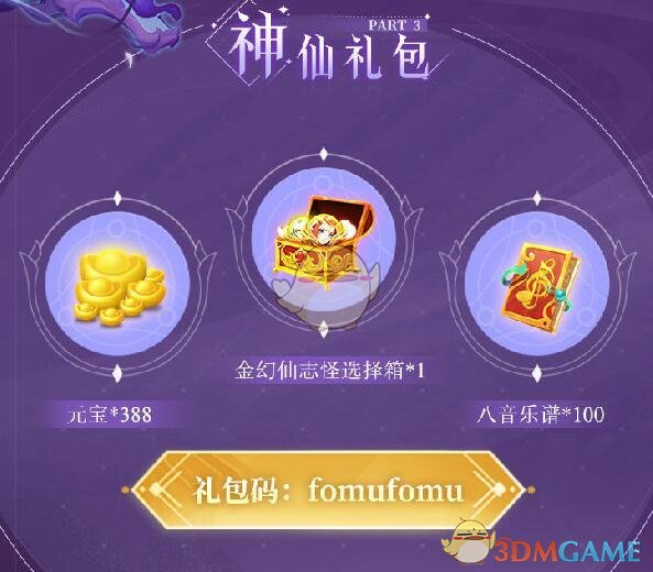 礼包内容:金幻仙志怪选择箱*1、元宝*388、八音乐谱*100