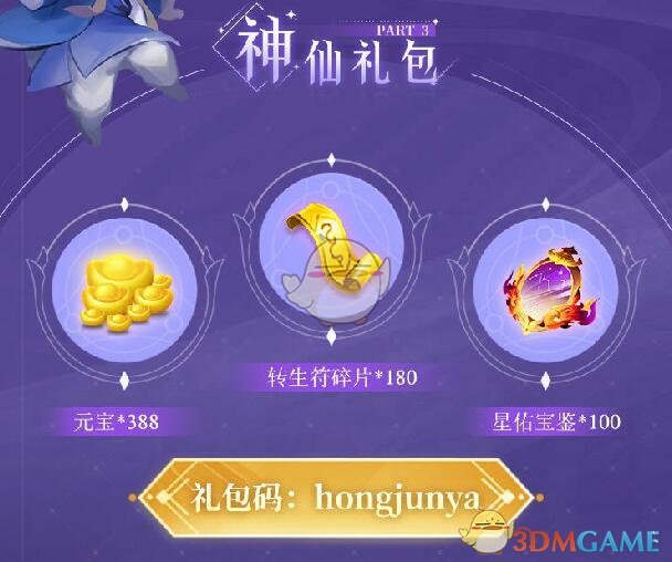 礼包内容:转生符碎片*180、元宝*388、星佑宝鉴100