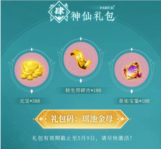 礼包内容:元宝x388、转生符碎片x180、星佑宝鉴x100