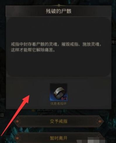 进入游戏我们来到残破的尸骸时需要交优胜者指环,如下图所示