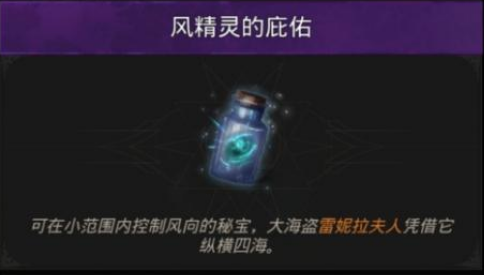 这个风精灵的庇护可以在小范围内控制风向的秘宝,大海盗雷妮拉夫人凭它纵横四海。