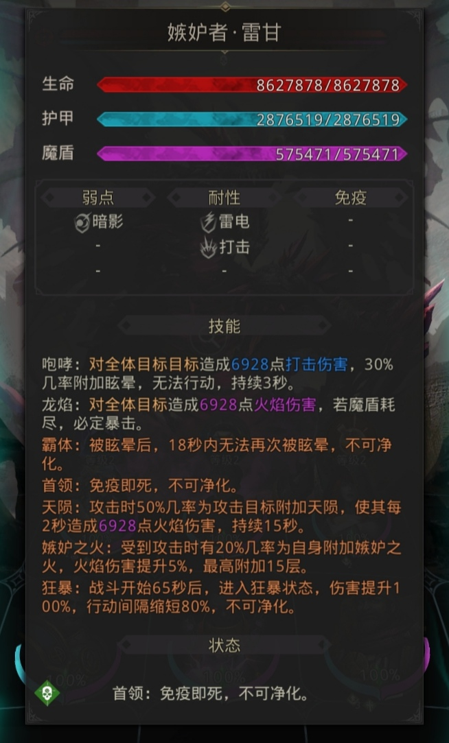 狂暴:战斗开始65秒后,进入狂暴状态,伤害提升100%,行动间隔缩短80%,不可净化。