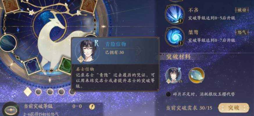2、当玩家抽卡抽取到重复的名士角色时,会自动转化成为对应角色的信物,玩家可以通过角色突破界面查看突破所需的信物数量;