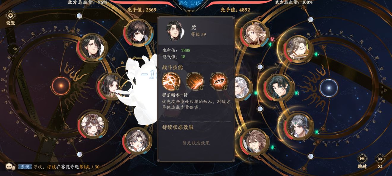 解释一下为什么小季站三号位很重要,因为陵是攻击血量最少的单位,开局对面四号位血量是低于奶妈的,而小季是攻击对面一列两个人,这样开局就压低了奶妈血线让陵直接切奶妈(小季的攻击力得达标,普通攻击一次将奶妈血打至比四号位更低,如图)。当然如果你练的是玉泽的话直接站六号位就好了,小季站位无要求。没有小季的把他换成攻击一列能打残奶妈的也行。