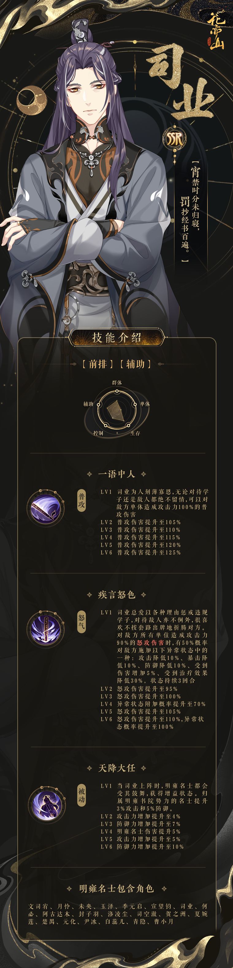 为感谢大家一直以来对书院的关心与支持,院司将于12月24日更新后为各位学子发放SSR名士【司业-陈喻言】,所有12月30日23:59之前登录的学子均可于邮箱内领取。