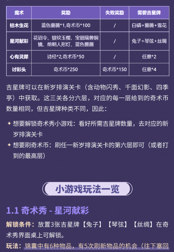 【星河献彩】:类似于抽奖,可获得花诏令、银纹玉樱、好感度礼物等,对应吉星牌可刷动物闪秀+千面幻影关卡