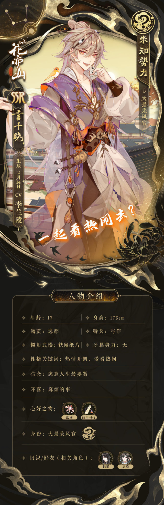 以上就是小编整理的关于《花亦山心之月》言千晓角色图鉴一览的全部内容,更多游戏攻略请持续关注手游网!