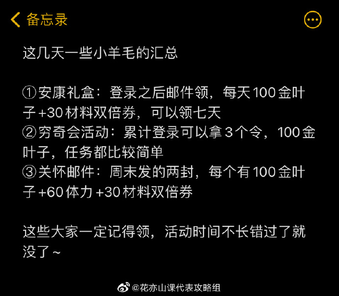 关怀邮件:周末发的两封,每个有100金叶子+60体力+30材料双倍劵