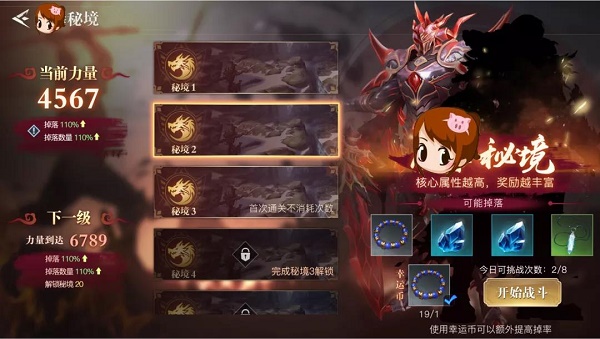 3、则温馨提示,随着力量值或智力值的提升,获得更高品质掉落武器的概率也会随之增加,大家在挑战副本之前一定要注意好自己的数值哦。