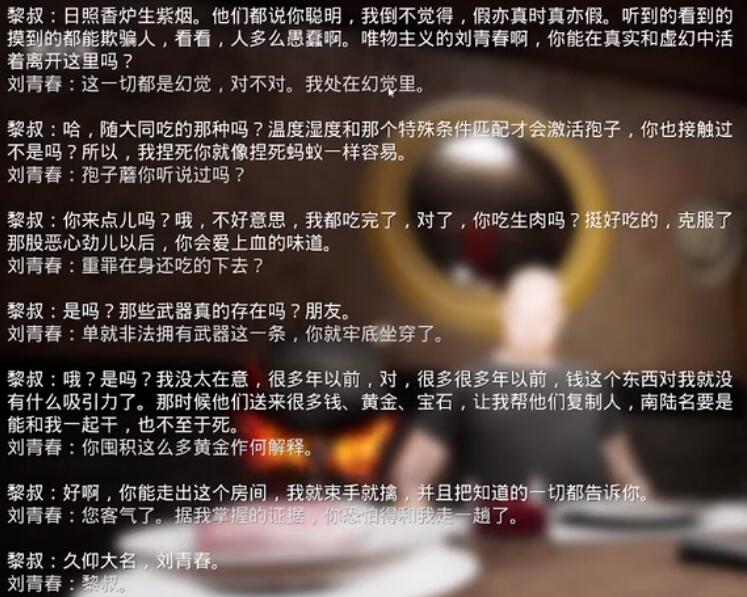 中毒:获得“吃饭”“财富”"蘑菇”“武器”后与黎叔对话获取线索