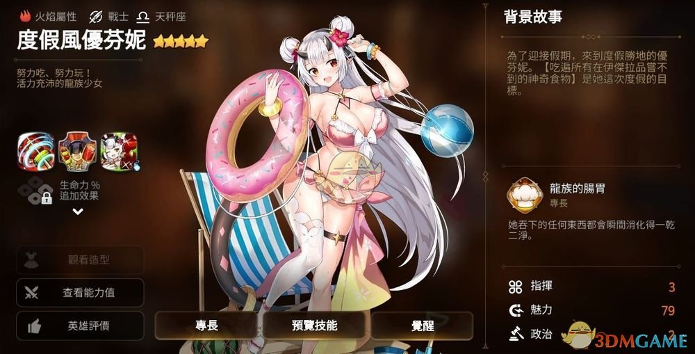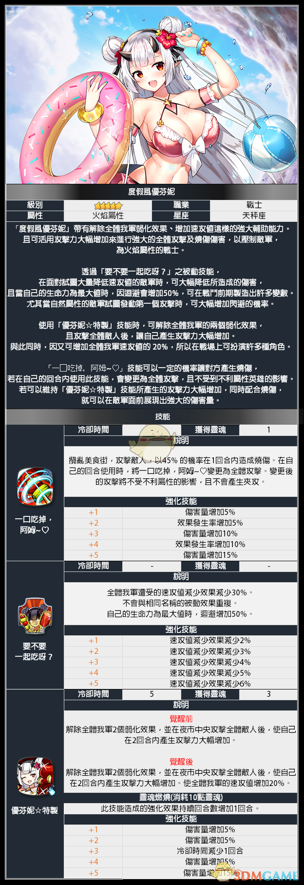 无论是何种食物都可以立刻消化掉,活力旺盛的龙族少女,火焰属性战士-「度假风优芬妮」来访。可解除全体我军弱化效果、并带有可增加速攻值的强大辅助能力,可用强大的全体攻击及烧伤伤害来压制敌军的「度假风优芬妮」,玩家不妨在限定召唤机率UP 中试着遇见她吧。