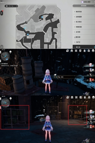 3、在然后我们来到地图的铆钉镇,在如下位置捡取第二个书页(货箱就是钥匙),其任务摆放具体位置在红框区域。