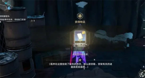 7:最后来到铆钉镇的废弃集市,我们在货架旁边,我们找到货箱,这个就是书页,我们来到中间的货架位置,拿起上层的货箱;