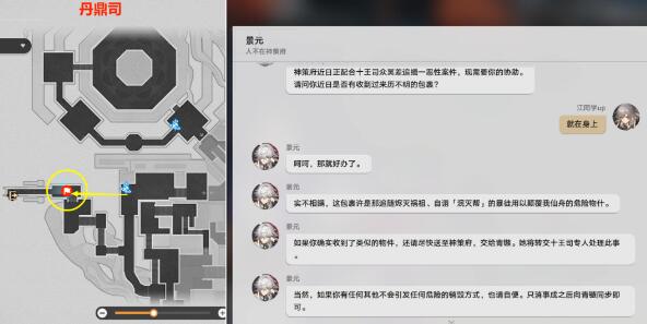 (2)然后来到下图【丹鼎司】海边位置,到该位置后,我们会收到【景元】的短信,让我们自己选择扔不扔炸弹