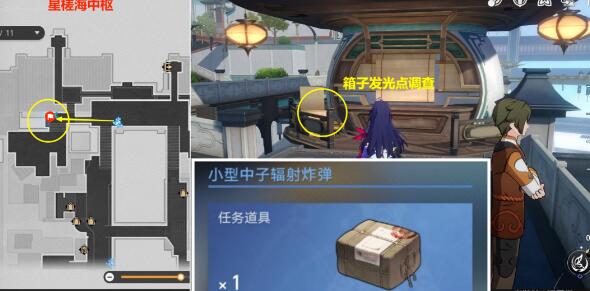 (1)首先查看你任务背包,是否已经有物品【小型中子辐射炸弹】,如果没有,先去下图【星槎海中枢】位置,【调查】箱子发光点后,获得该任务物品