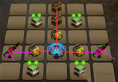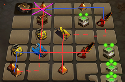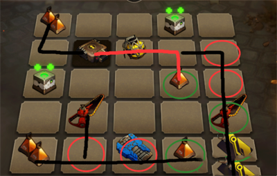 门卡再试用角色对角,玩家先去黑线拿炸弹(可以不拿),红色线打怪。