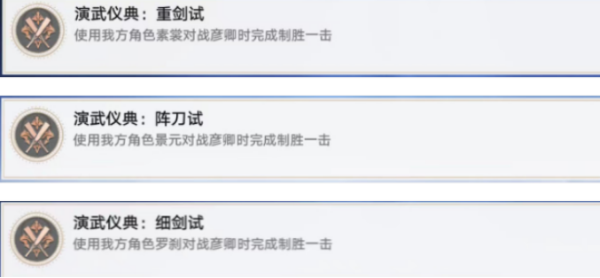 分别用素裳,景元,罗刹击败彦卿,即可分别获得成就“演武仪典:重剑试““演武仪典:阵刀试““演武仪典:细剑试“。(可在忘却之庭—“仙舟回忆其二“中完成)