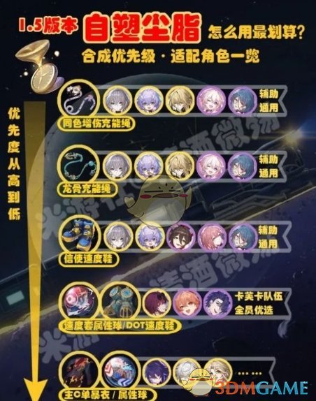 匹诺康尼充能绳 > 龙骨充能绳 > 信使速度鞋 > 速度套/DOT套属性球 > 主C暴击衣/属性球