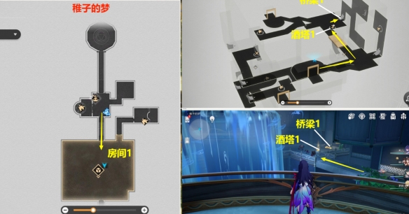 (1)先进入【房间1】,进入后,右边下去,从【酒塔1】获得次数后,从【桥梁1】上去
