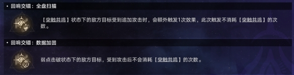 回响交错:两个回响交错非必须,硬要选择的话建议选与虚无命途的交错【数据加固】,可以使我们在前期面对无法召唤小怪的精英怪时不会太乏力。