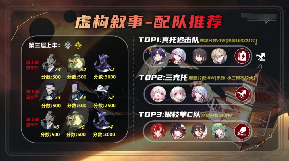 本期虚构叙事整体体验下来,携带追击体系只要队伍里有托帕、砂金、克拉拉、三月七,选择合适的荒腔走板就很容易满星;非追击体系如果按传统携带生存位的玩法,(尤其是生存位无辅助作用)零星魂且练度一般的情况下则很难拿高分;但由于2.1版本虚构叙事敌人数量大幅削减,因此单C直伤队也可以考虑不带生存角色,更有可能取得高分;