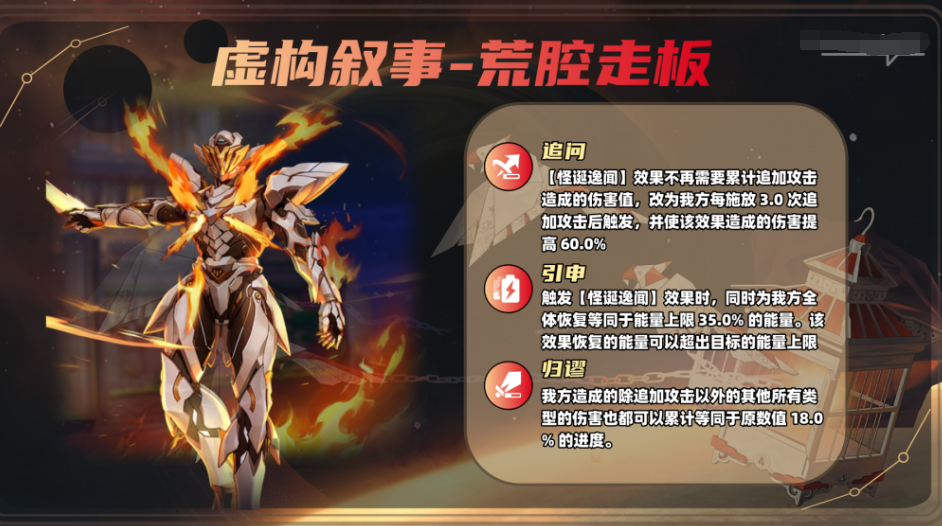 而其他所有不具备追加攻击的角色,也只能选择该荒腔走板;只是由于叠层速度大幅减慢,因此还是建议选择数值伤害较高或出伤频率较快的体系(黄泉队、DOT队等);溢出的伤害也能存起来为下次怪诞逸闻的释放叠层;