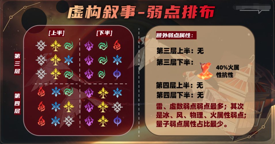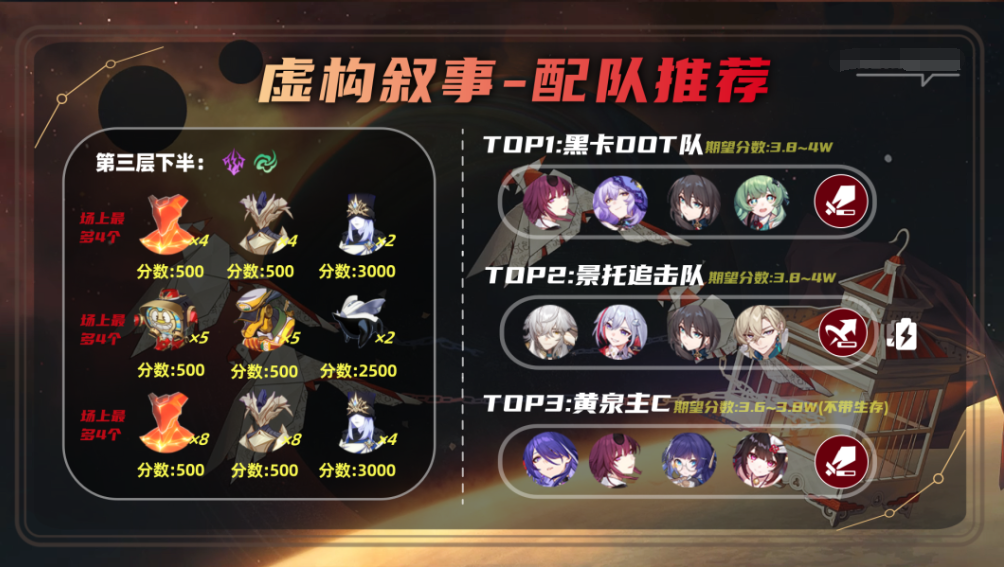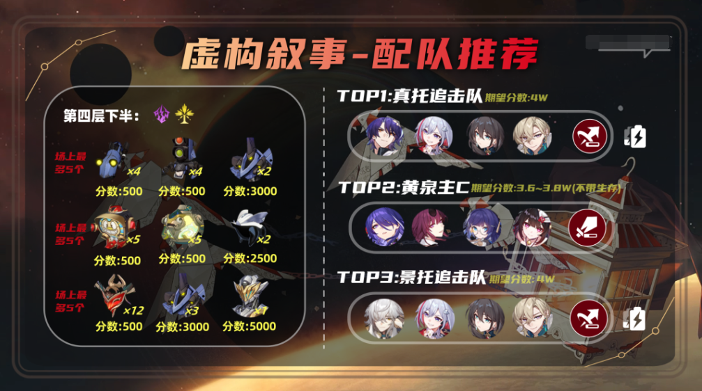 三层与四层的下半都是雷属性弱点拉满的环境,受本期虚构buff影响,最优先推荐的是景托(注意不是景元单C,景元追加攻击的频率会跟不上),其次是黑卡DOT队(三层下全零星魂低练度也很容易拿满分,但是四层下有一定的练度才会好打,这其中部分原因是无风弱点);至于黄泉主C队:只有零星魂时,建议舍弃生存,队友带两名虚无、一名同谐角色才更能保证取得高分;