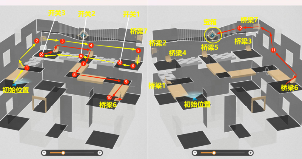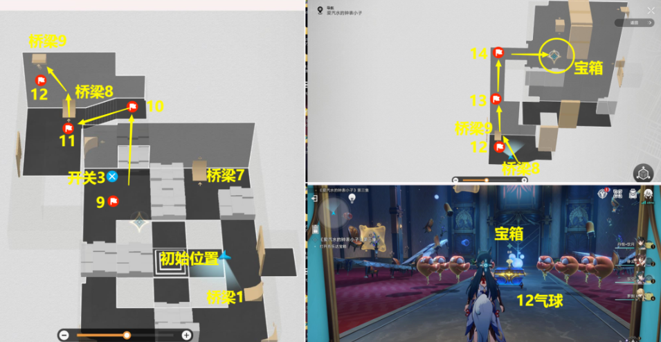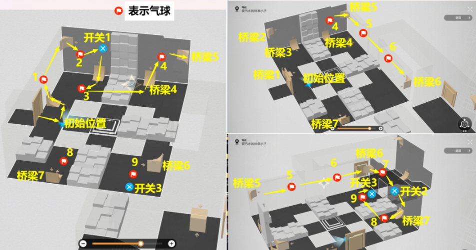 4、难度3副本解密:按照【桥梁1】到【桥梁9】路线,打掉路上遇到的14个气球和打开路上遇到的3个开关,开了最后的宝箱后(开宝箱前先将宝箱周围12个气球打掉),该副本结束;