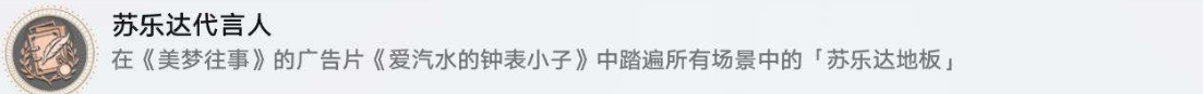 成就描述:在《美梦往事》的广告片《爱汽水的钟表小子》中踏遍所有场景中的「苏乐达地板」。