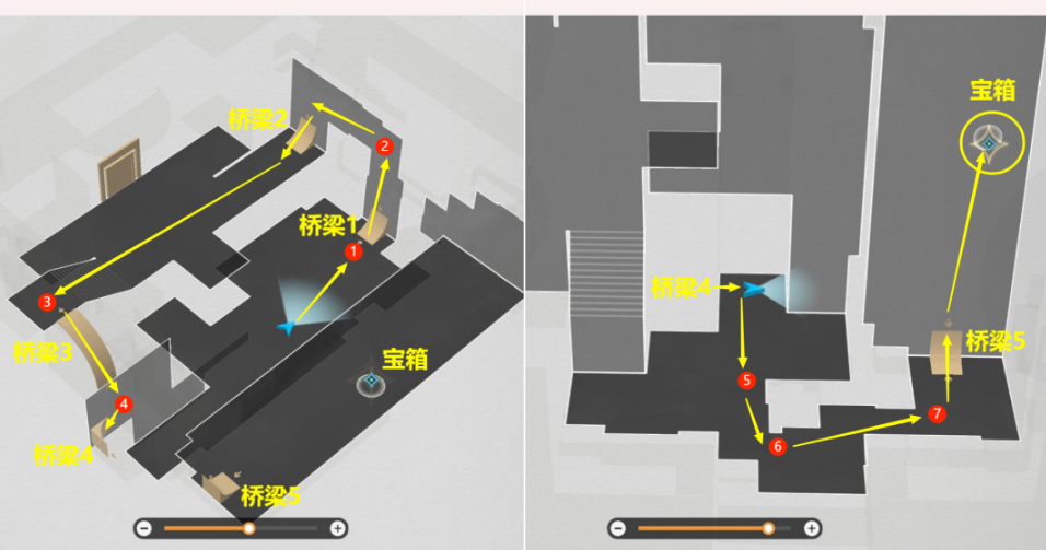 2、难度1副本解密:按照【桥梁1】到【桥梁5】路线,打掉路上遇到的7个气球,开了最后的宝箱后,该副本结束;