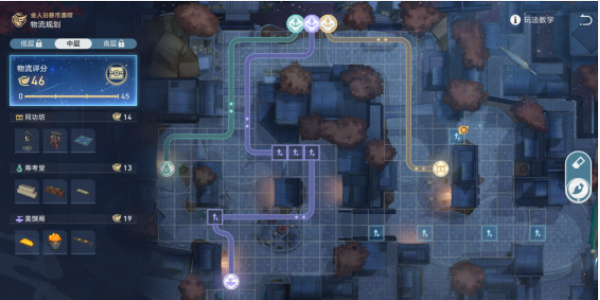 2、中层的难度稍微有点高,玩家需要认真规划,尽量保持最大利益;中层物流路线规划如图所示。