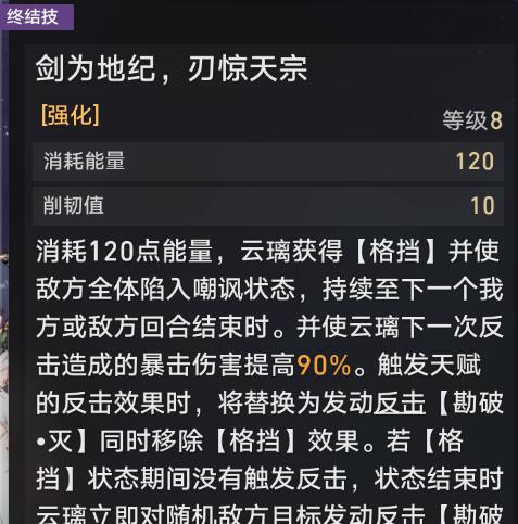 反击需要对到攻击频率高的敌人,假如敌人数量少或是攻击频率低,这样也就无法频繁触发,云璃的终结技反击视为追击伤害,又是群伤技能,所以不论是智识、欢愉、毁灭的祝福她都能吃,加上触发格挡反击的【勘破·灭】,更是有着对单的额外弹射伤害。