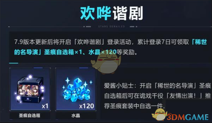累计登录7日,可领取「稀世的名导演」圣痕自选箱×1、水晶×120等奖励。可随机获取套装中的一件。